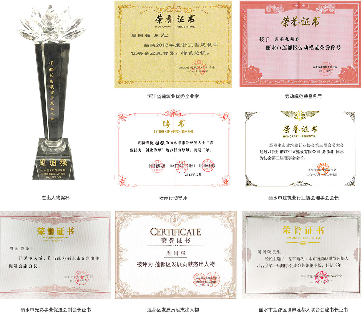2018年7月當選為麗水市建筑業(yè)行業(yè)協(xié)會理事會會長,2019年3月被浙江省建筑業(yè)行業(yè)協(xié)會評為2018年度浙江省建筑業(yè)優(yōu)秀企業(yè)家。