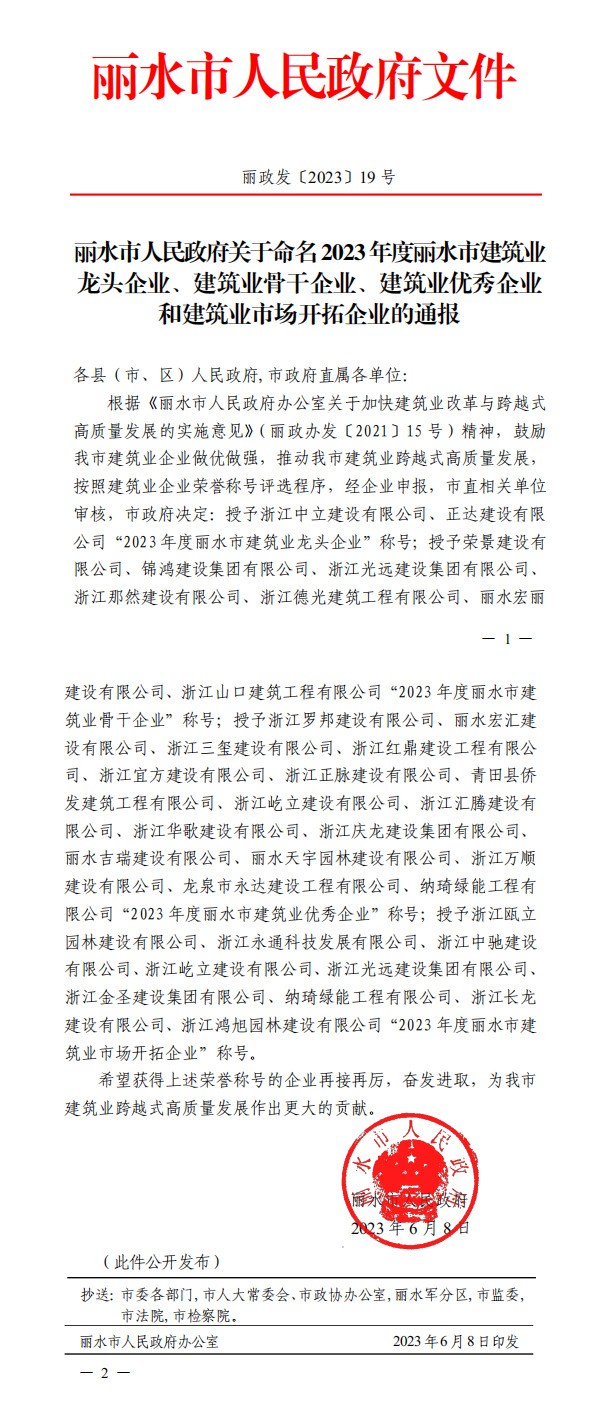 浙江中立建設(shè)有限公司、正達(dá)建設(shè)有限公司被授予“2023年度麗水市建筑業(yè)龍頭企業(yè)”稱(chēng)號(hào)。