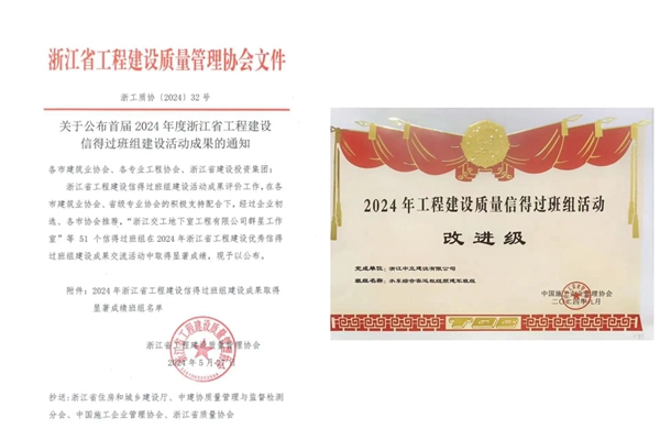 在2024年度工程建設質(zhì)量信得過班組比賽中,我公司水東樞紐項目團隊獲得浙江省建設成果取得顯著成績班組和中國施工企業(yè)管理協(xié)會《2024年度工程建設質(zhì)量信得過班組改進級》。
