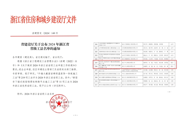 在2024年浙江省省級工法評選中,“富水軟土地質(zhì)條件下灌注樁高效接樁施工工法”與“基于BIM技術復雜大曲面GRC安裝施工工法”2項工法榮獲浙江省省級工法。