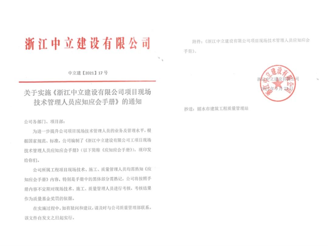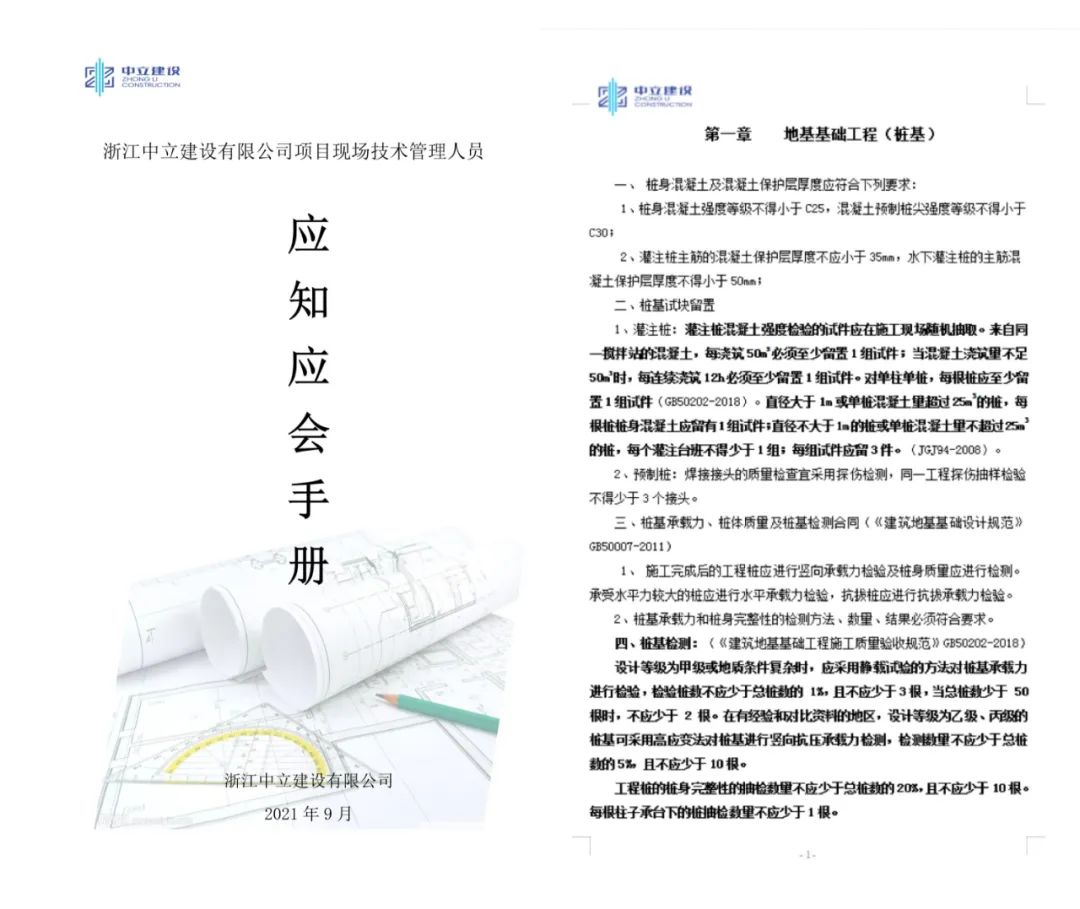 為進(jìn)一步提升公司項(xiàng)目現(xiàn)場技術(shù)管理人員的整體業(yè)務(wù)和管理水平,積極開展“質(zhì)量月”活動(dòng),根據(jù)國家標(biāo)準(zhǔn)規(guī)范,中立建設(shè)編制了《浙江中立建設(shè)有限公司工項(xiàng)目現(xiàn)場技術(shù)管理人員應(yīng)知應(yīng)會(huì)手冊》,并于9月23日發(fā)文實(shí)施。這是繼今年6月份我公司出臺(tái)的《工程質(zhì)量通病防治(2021試行)》后的又一重要技術(shù)性手冊。